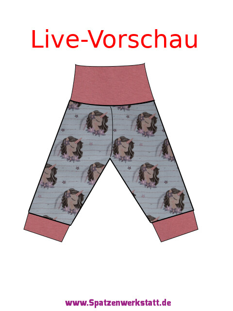 Für das Modellbeispiel auf dem Foto wurden folgende Farbmuster gewählt: Hose ist aus grauem Baumwolljersey mit Einhorn-Motiv und die Bündchen in altrosa gewählt.