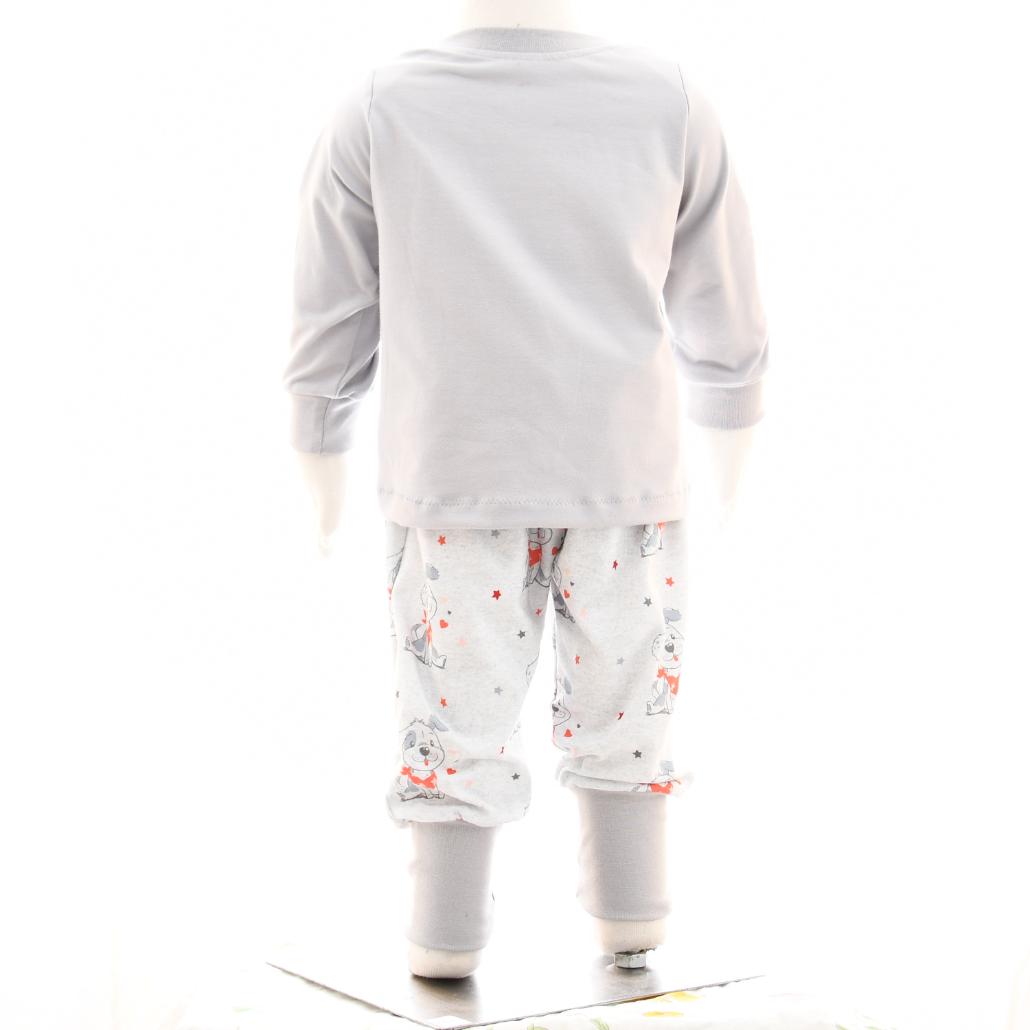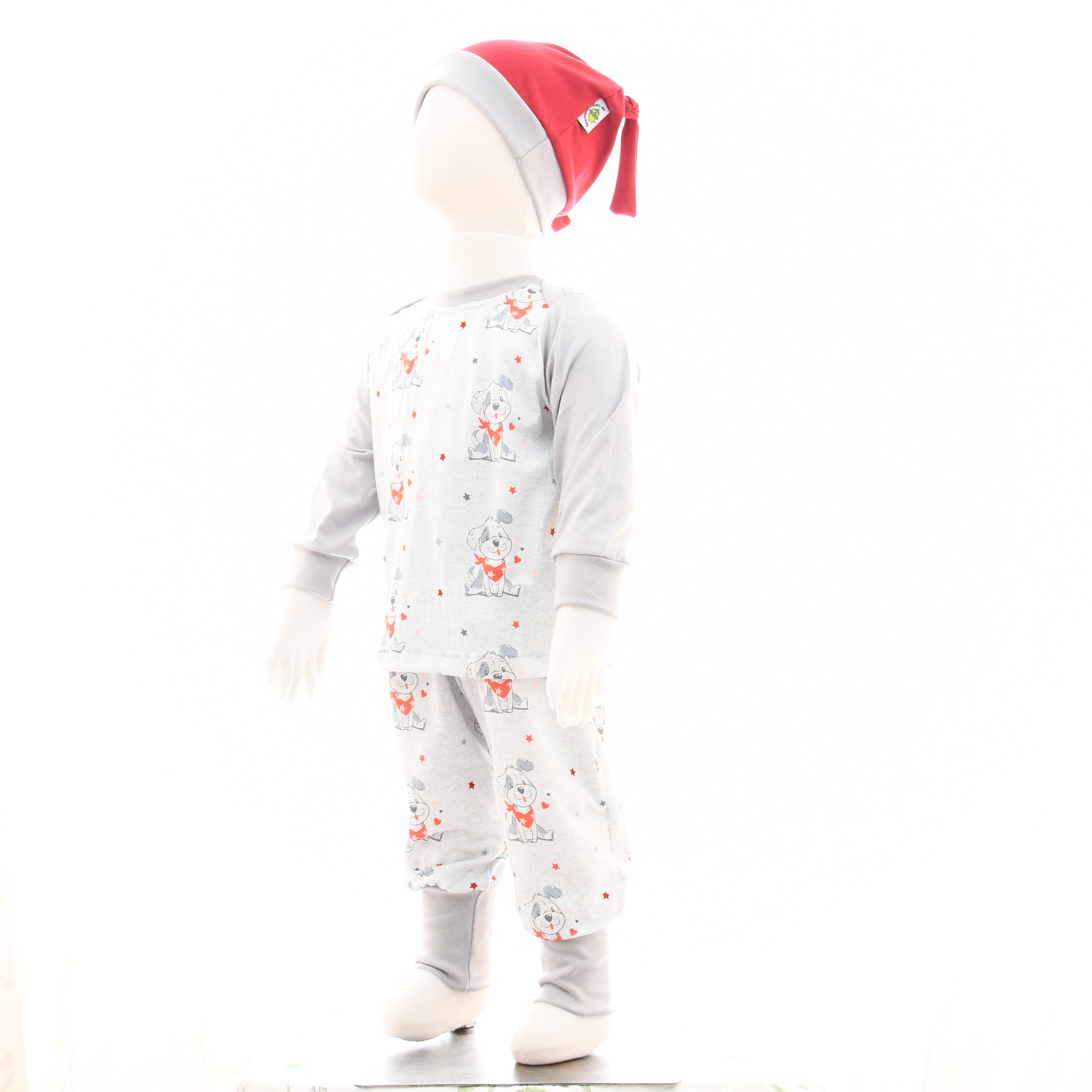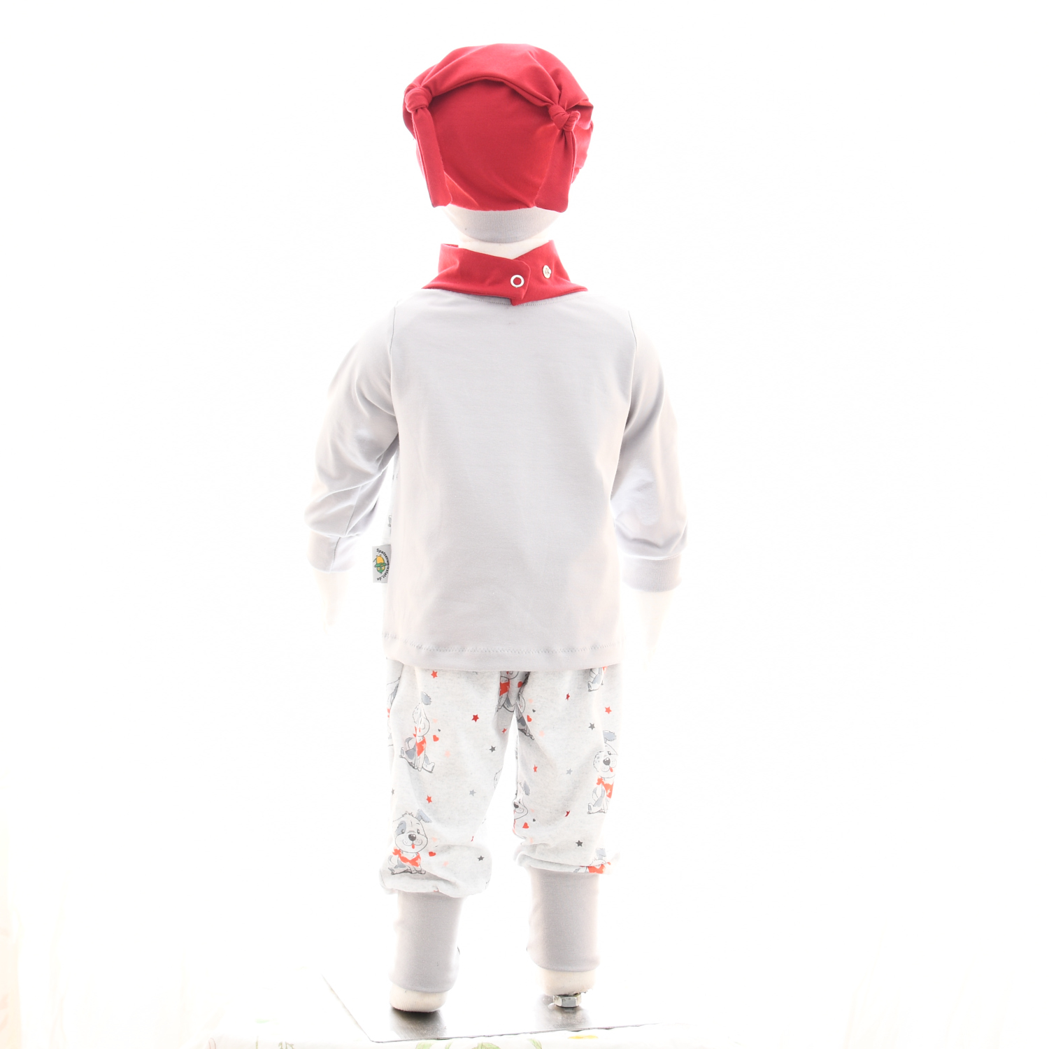 Das Set aus hellgrauem Baumwolljersey, bestehend aus Pullover und Hose. Die Vorderseite vom Pullover ist aus hellgrau-meliertem Jersey mit einem niedlichen Hundemotiv gefertigt, Rückteil und Ärmel sind aus hellgrauem Baumwolljersey. Die Hose ist passend zum Pullover ebenfalls aus hellgrau-meliertem Jersey mit einem niedlichen Hundemotiv gefertigt. Die Bündchen sind in hellgrau gehalten. Optional ergänzen ein bordeauxfarbenes Halstuch und eine bordeauxfarbene Mütze das Outfit.