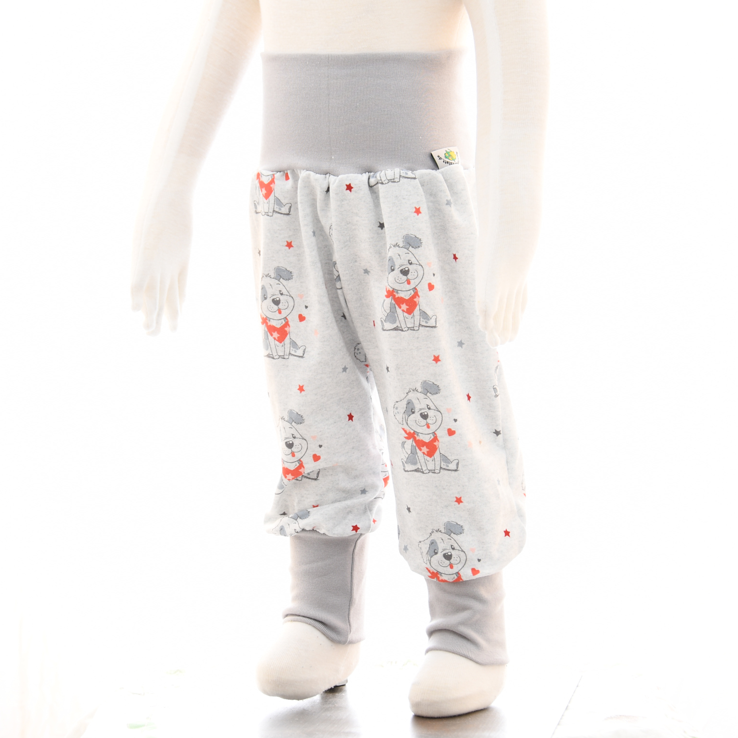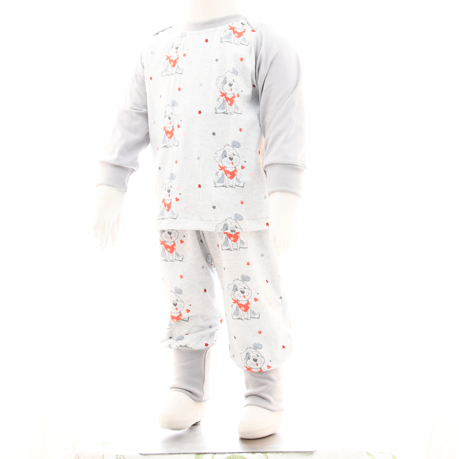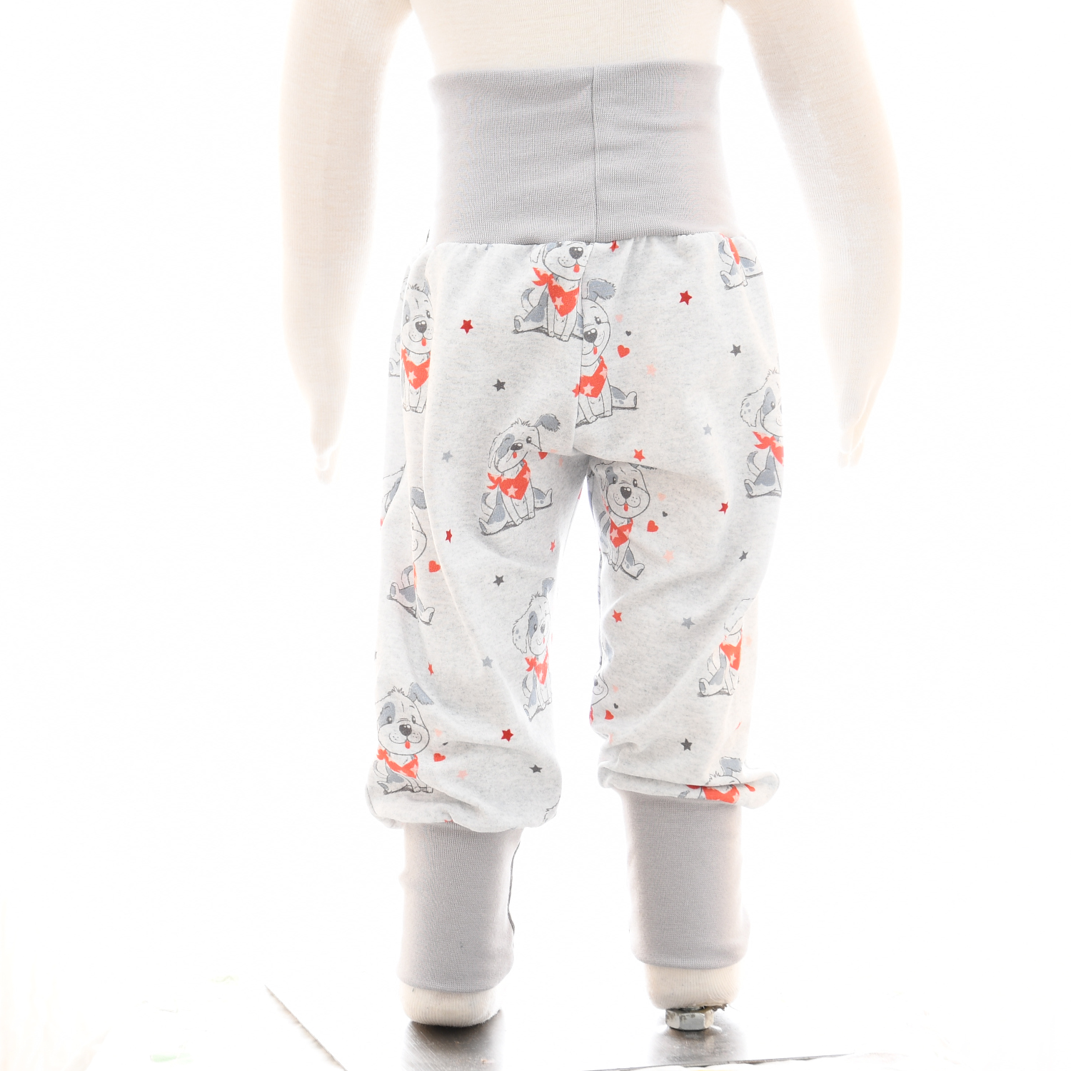 Das Set aus hellgrauem Baumwolljersey, bestehend aus Pullover und Hose. Die Vorderseite vom Pullover ist aus hellgrau-meliertem Jersey mit einem niedlichen Hundemotiv gefertigt, Rückteil und Ärmel sind aus hellgrauem Baumwolljersey. Die Hose ist passend zum Pullover ebenfalls aus hellgrau-meliertem Jersey mit einem niedlichen Hundemotiv gefertigt. Die Bündchen sind in hellgrau gehalten. Optional ergänzen ein bordeauxfarbenes Halstuch und eine bordeauxfarbene Mütze das Outfit.