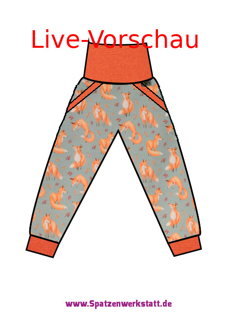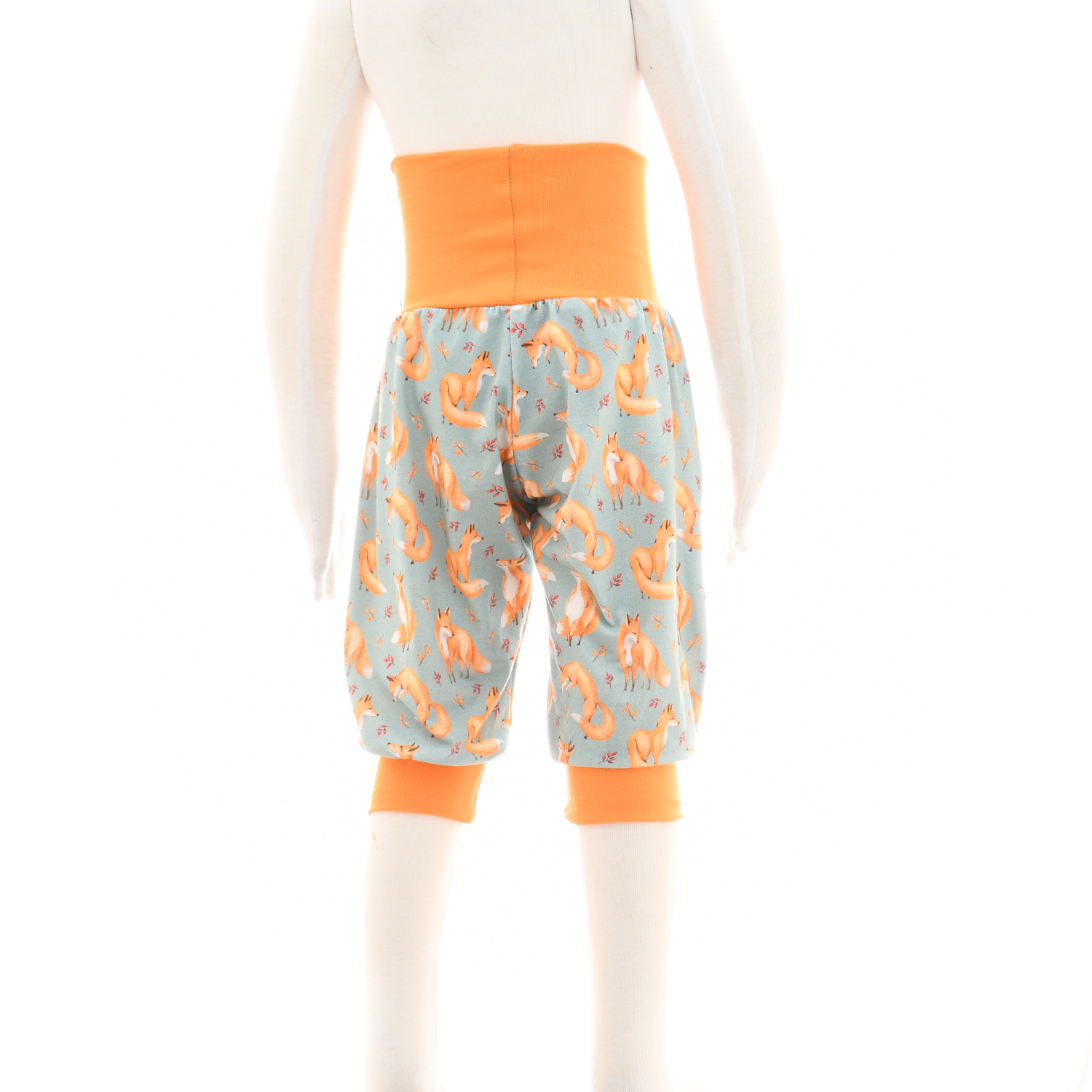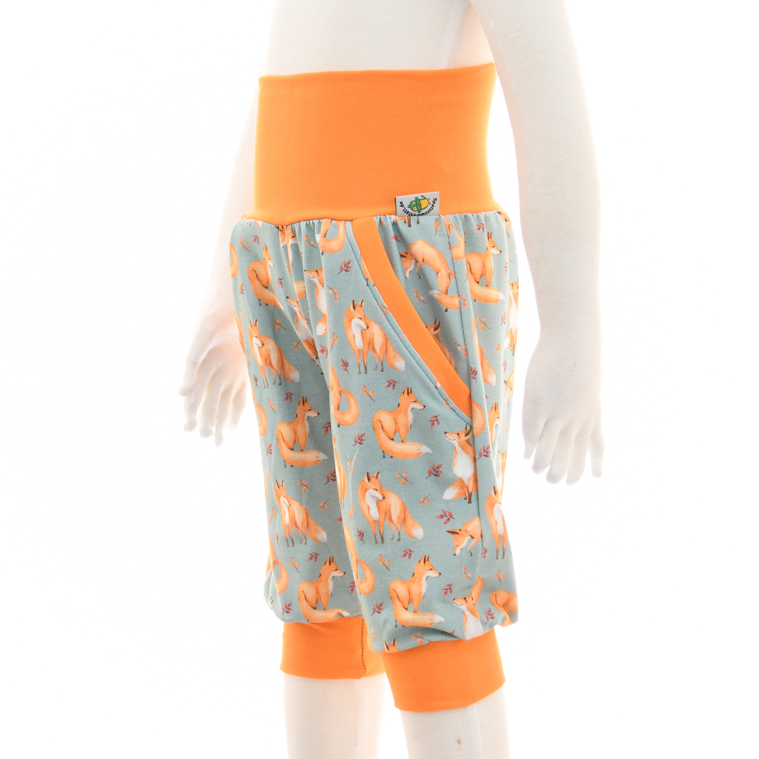 Für das Modellbeispiel auf dem Foto wurden folgende Farbmuster gewählt: Die Dreiviertelhose mit Taschen ist aus mintgrünem Baumwolljersey mit Fuchs-Motiv gearbeitet. Die Bündchen sind in orange gewählt.