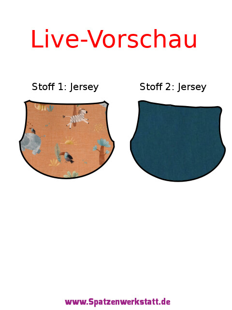 Für das Modellbeispiel auf dem Foto wurden folgende Farbmuster gewählt: Aussenseite ist in senfgelben Baumwolljersey mit Safari-Motiv und die Innenseite ist in petrolfarbenem Baumwolljersey gearbeitet.