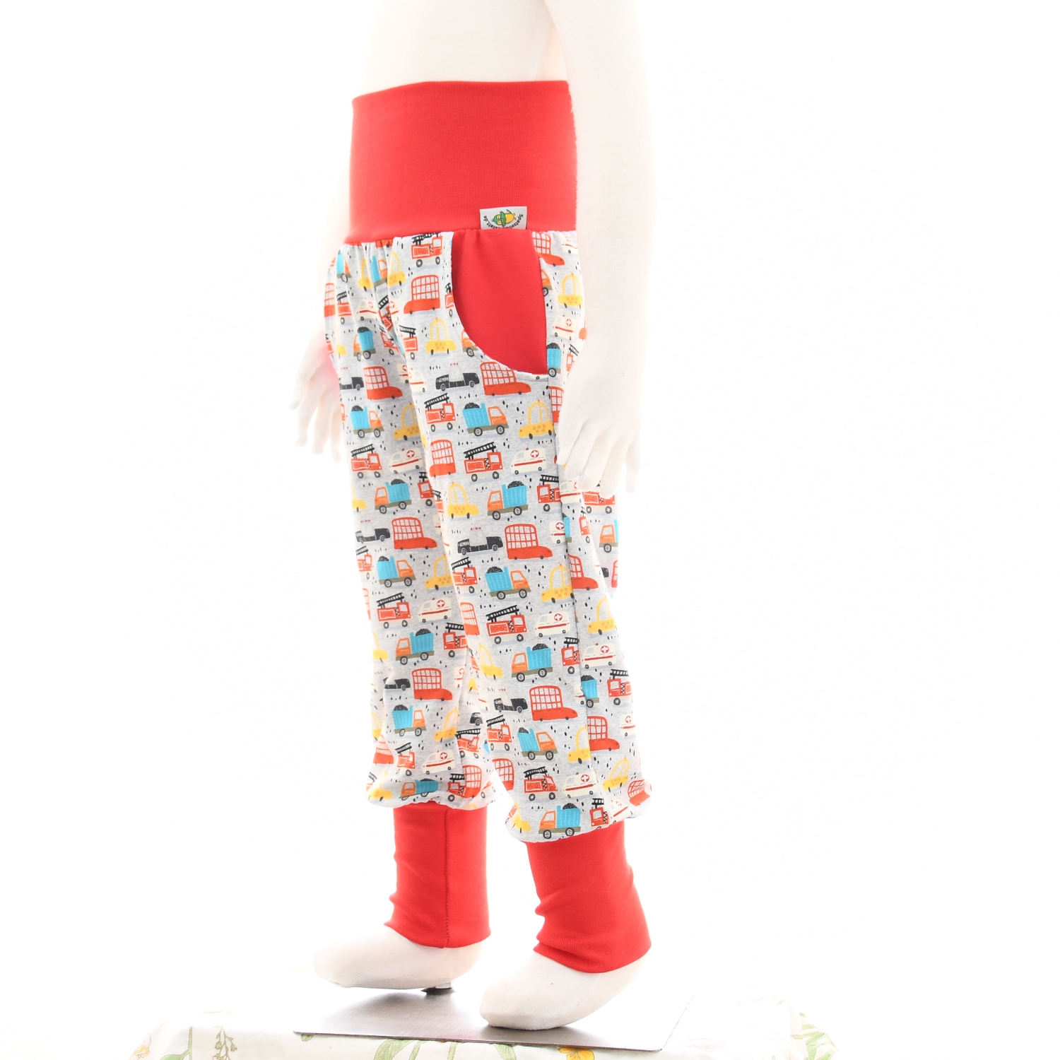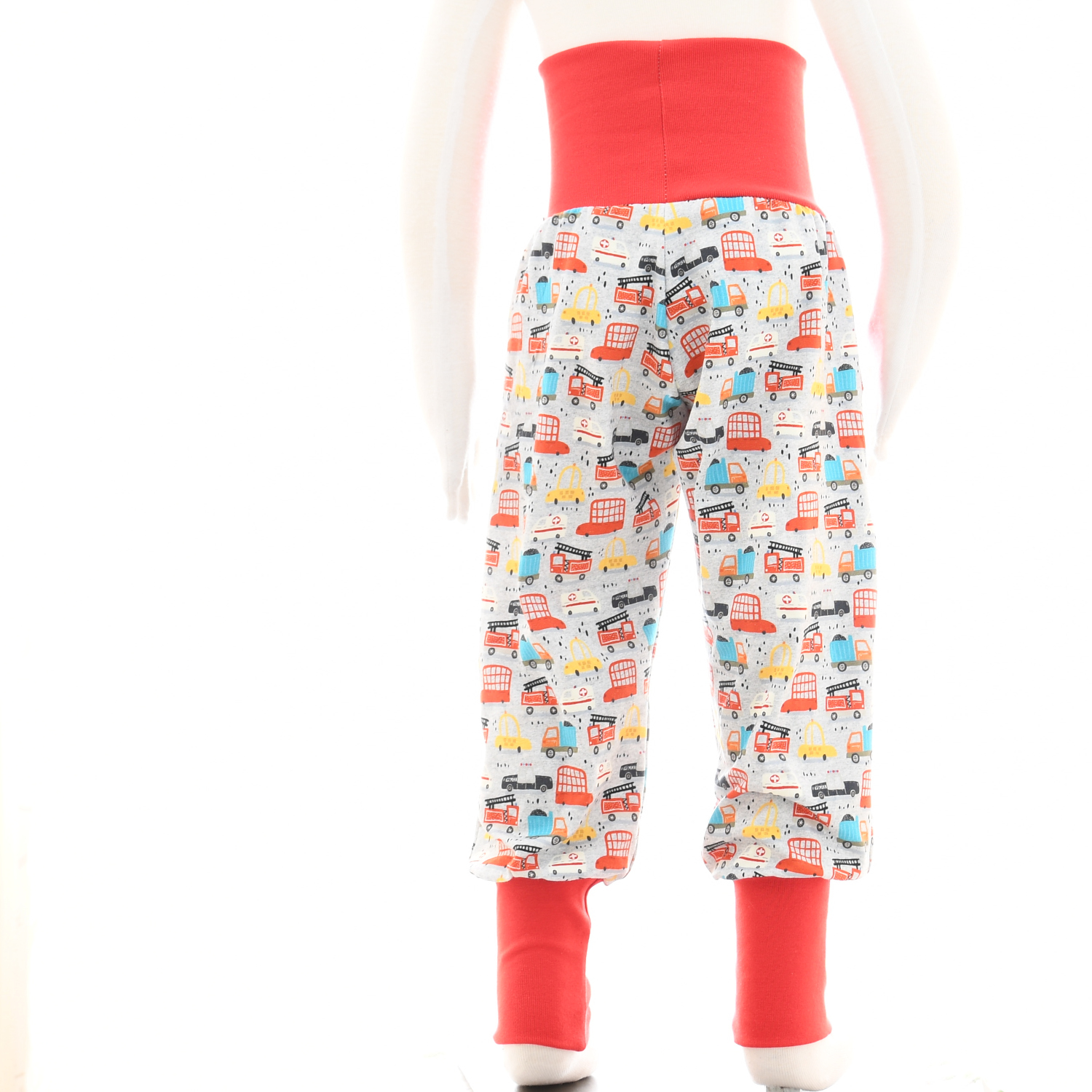 Unsere Jerseypumphose Fahrzeuge mit praktischen Taschen überzeugt durch hohen Tragekomfort und individuelle Gestaltungsmöglichkeiten. Der Stoff ist hellgraumeliert und mit detailreichen Fahrzeugmotiven bedruckt. Taschen und Bündchen in Rot setzen einen kontrastreichen Akzent und runden das Design ab.