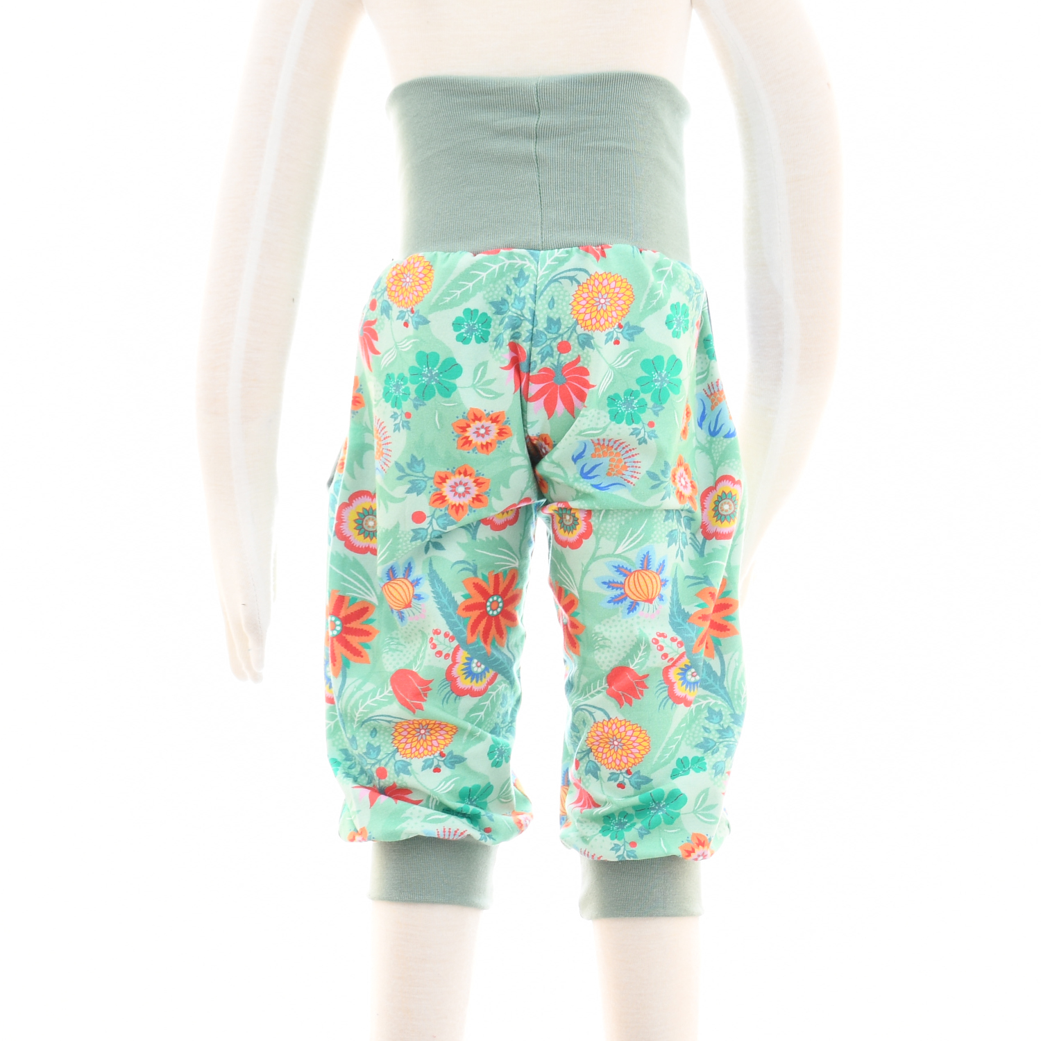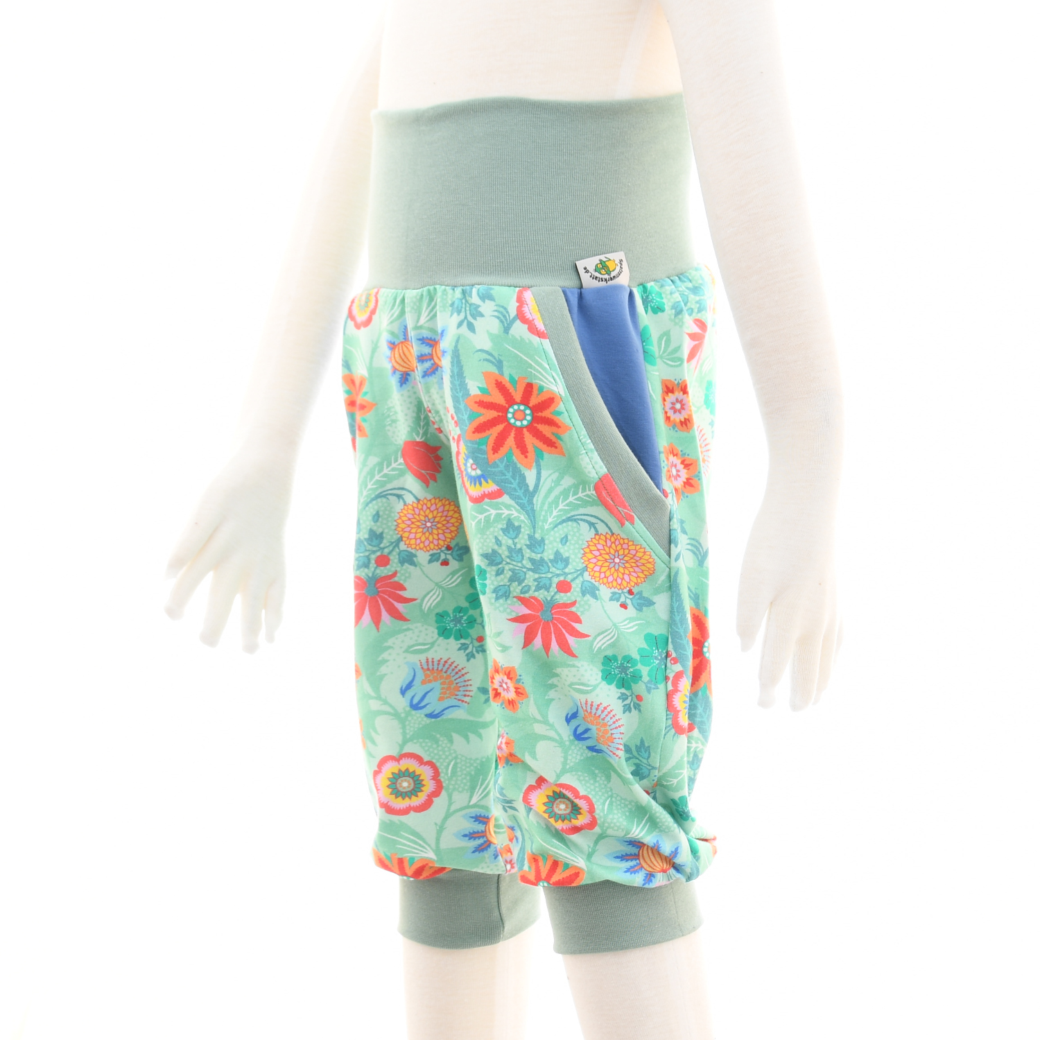 Für das Modellbeispiel auf dem Foto wurden folgende Farbmuster gewählt: Caprihose ist aus grünem Baumwolljersey mit Blumen-Motiv, die Taschen sind aus jeansblauem Baumwolljersey und die Bündchen in meergrün gewählt.