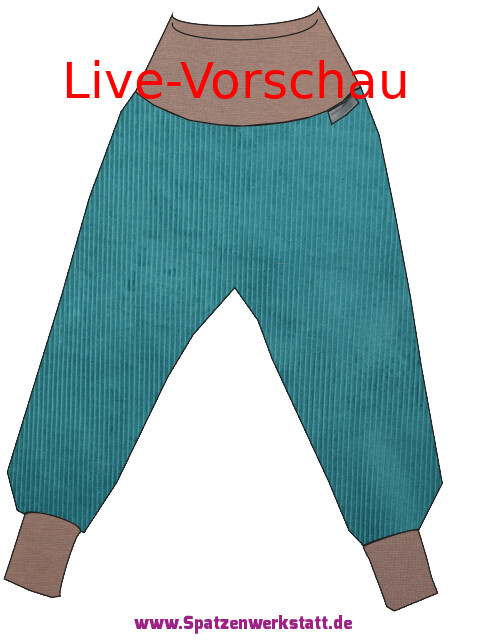Für das Modellbeispiel auf dem Foto wurden folgende Farbmuster gewählt: Die Hose ist aus petrolfarbenem Cordstoff und die Bündchen in schlammfarbe gewählt.