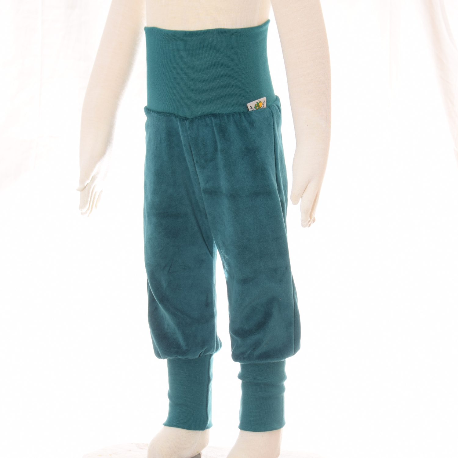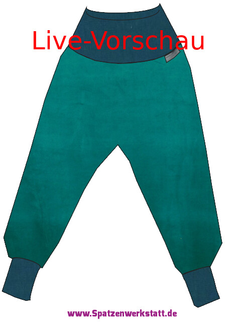 Für das Modellbeispiel auf dem Foto wurden folgende Farbmuster gewählt: Hose aus petrolfarbenem Nickistoff und die Bündchen in petrol.