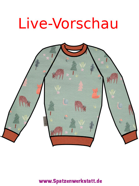 Für das Modellbeispiel auf dem Foto wurden folgende Farbmuster gewählt: Das Vorderteil ist aus grünem Baumwolljersey mit Waldtier- Motiv gewählt. Das Rückteil und die Ärmel sind ebenfalls aus grünem Baumwolljersey mit Waldtier-Motiv und die Bündchen aus rostfarbenem Bündchenstoff gewählt.